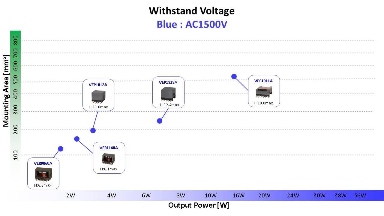 当社の車載対応トランスは、実装面積と出力電力の最適なバランスを実現しています。