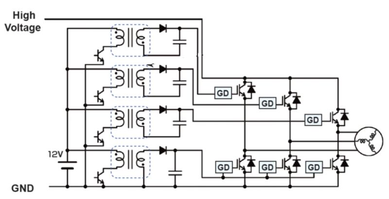 電気自動車やハイブリッド車のインバータシステムにおいて、IGBTパワーデバイスのゲートドライブ回路用絶縁電源は、システムの信頼性を左右する重要な要素です。